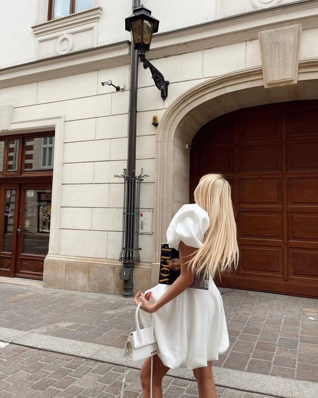 Świetna sukienka z pufisatym rękawem, oraz gumką na dole dzięki czemu tworzy się ładna bombka. Sukienka jest idealna na różnego rodzaju okazje.