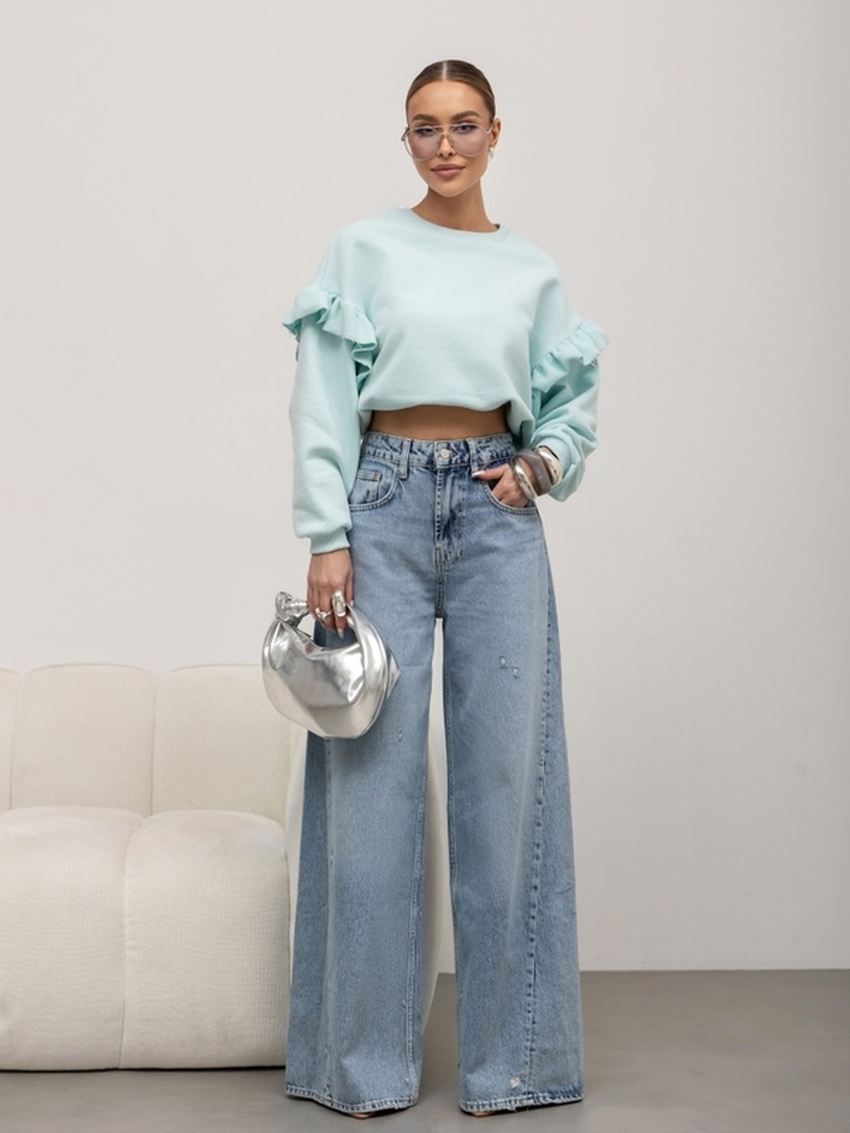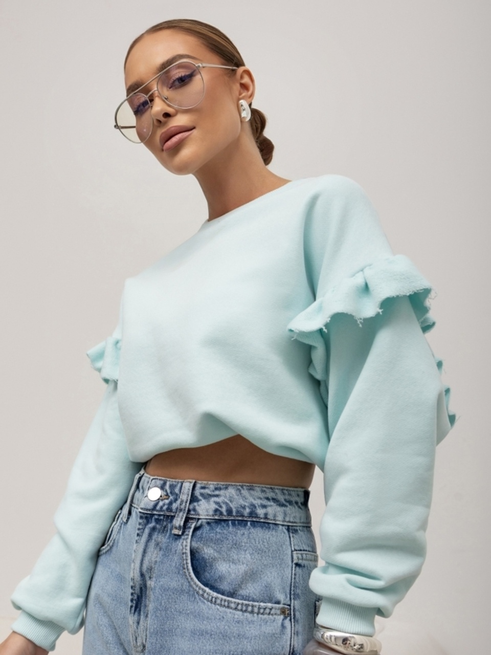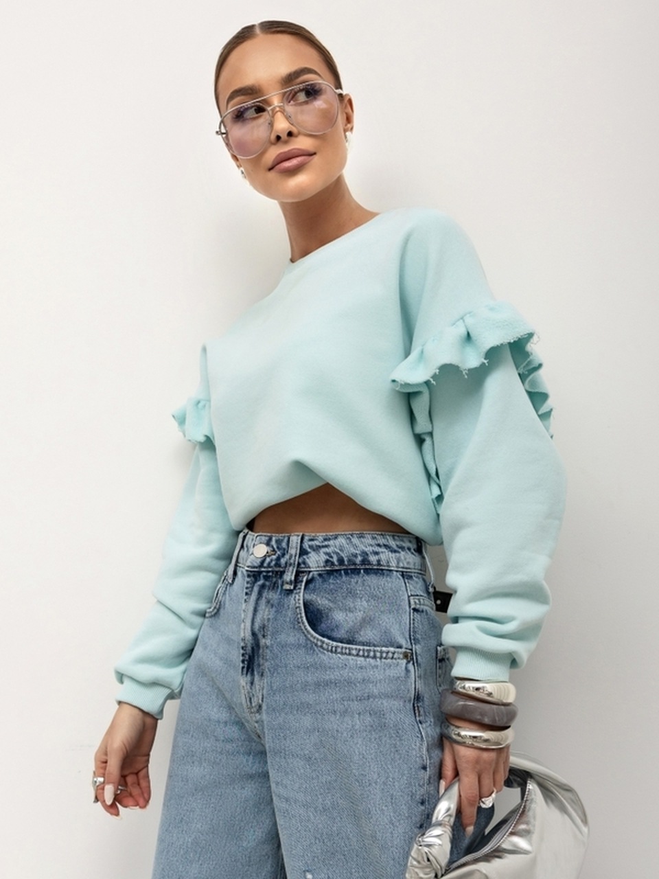 Bluza łącząca sportowy komfort z kobiecą elegancją. Model w modnych odcieniach przyciąga uwagę efektownymi falbanami na rękawach, które nadają całości nowoczesnego i stylowego charakteru. Miękka, przyjemna w dotyku dzianina zapewnia wygodę noszenia przez cały dzień. Świetnie komponuje się z jeansami z wysokim stanem jak i spódnicami.
