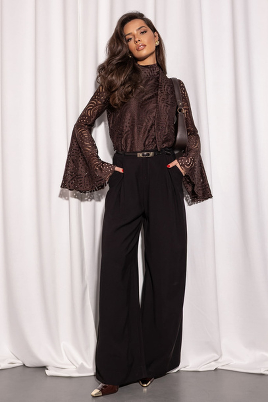 Elegancka bluzka, wykonana z delikatnej koronki, która dodaje subtelności i kobiecego uroku. Model posiada długie, lekko prześwitujące rękawy zakończone rozkloszowanym mankietem w stylu boho-chic. Bluzka świetnie sprawdzi się zarówno w eleganckich stylizacjach, jak i w bardziej codziennych zestawach z jeansami czy spodniami z wysokim stanem.