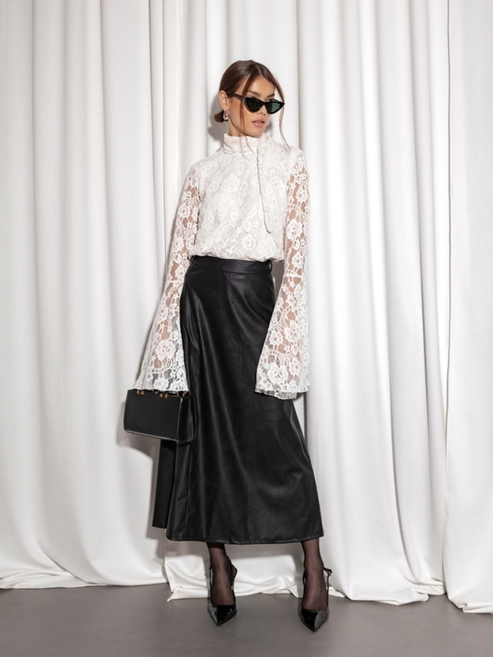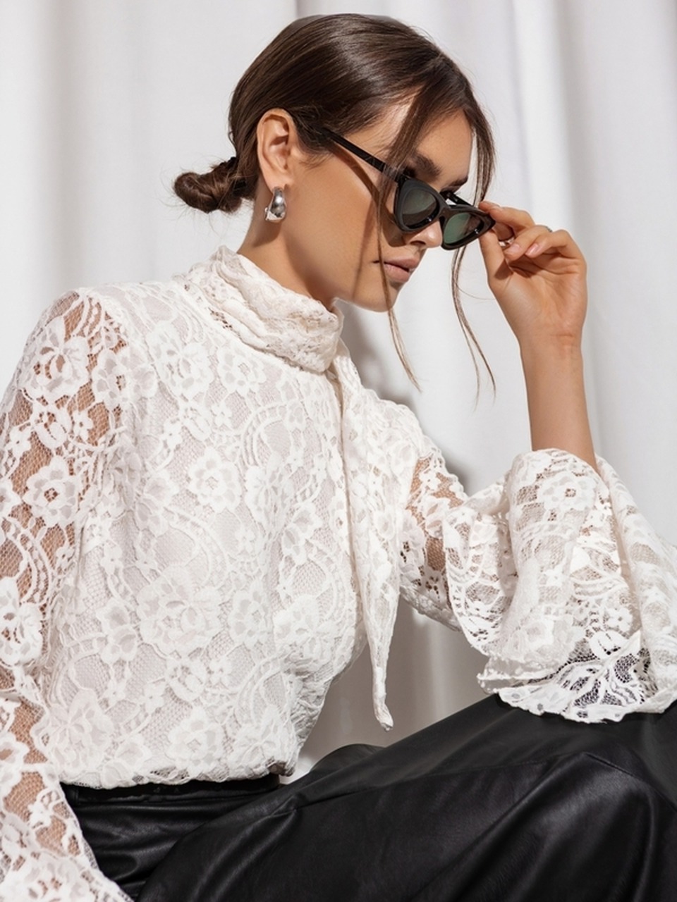 Elegancka bluzka, wykonana z delikatnej koronki, która dodaje subtelności i kobiecego uroku. Model posiada długie, lekko prześwitujące rękawy zakończone rozkloszowanym mankietem w stylu boho-chic. Bluzka świetnie sprawdzi się zarówno w eleganckich stylizacjach, jak i w bardziej codziennych zestawach z jeansami czy spodniami z wysokim stanem.