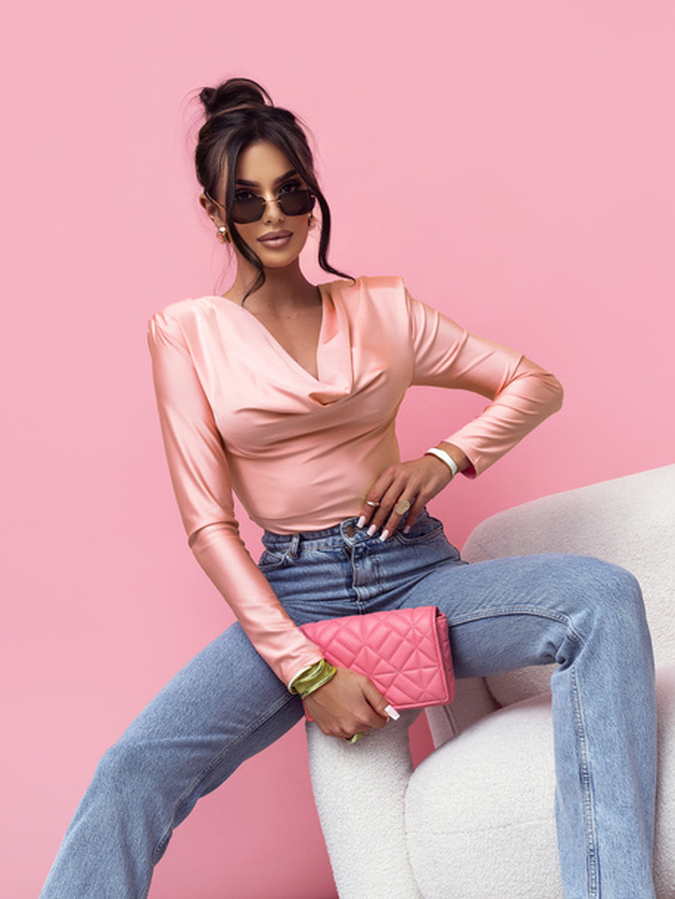 Przepiękne body z lejącym dekoltem, oraz wycięciem na plecach. Jest to propozycja łącząca sportowy i elegancki styl, idealne do spodni oraz spódnic.