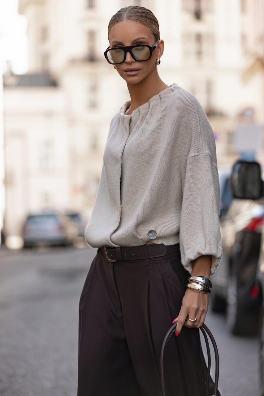 Świetny sweterek o kroju modnej bomberki, idealnie sprawdzi się do sportowych jak i eleganckich stylizacji. Zapinany jest na stylowe złote napy, natomiast z tyłu posiada marszczenie które sprawia, że bomberka nie wygląda na obszerną.