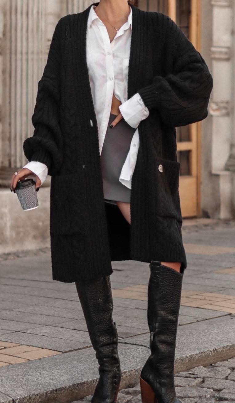 Sweter to doskonałe połączenie stylu i wygody. Średniej długości kardigan, zapinany na jeden guzik. Rękawy zakończone są ściągaczami. Posiada dwie pojemne kieszenie, które dodają praktyczności. Charakterystyczny splot typu warkocz nadaje mu unikalny wygląd, a rozcięcia po bokach swobodnego ruchu.