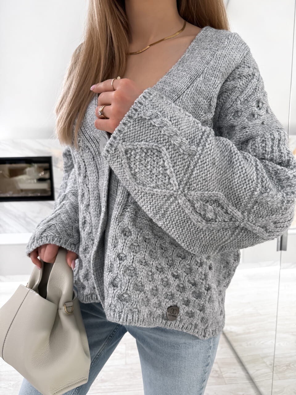 Sweter to doskonałe połączenie stylu i wygody. Średniej długości kardigan, zapinany na trzy guziki. Charakterystyczny splot typu warkocz nadaje mu unikalny wygląd.