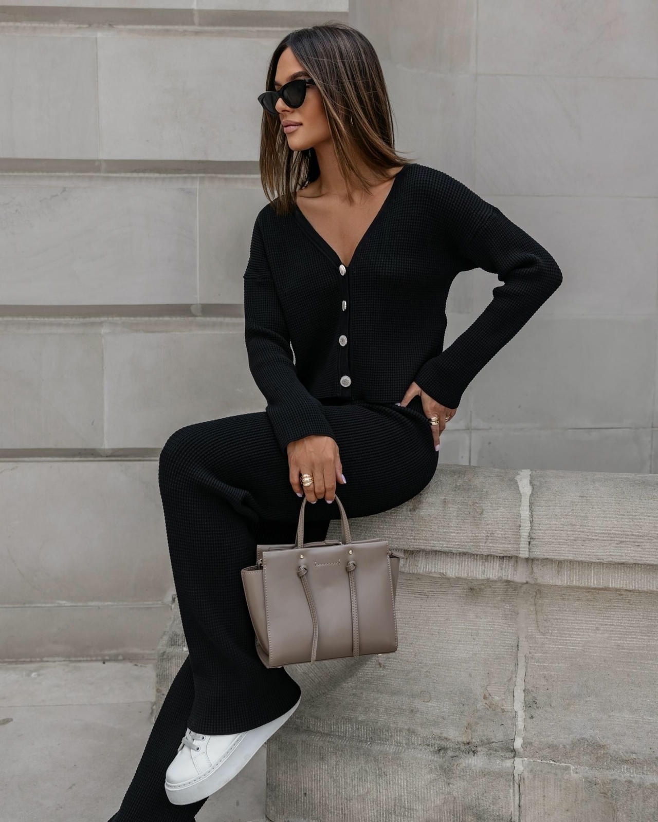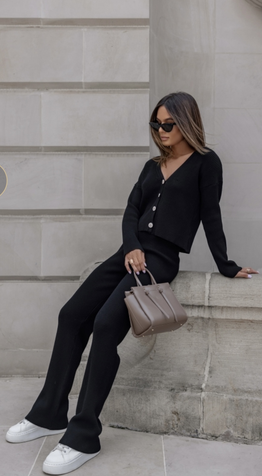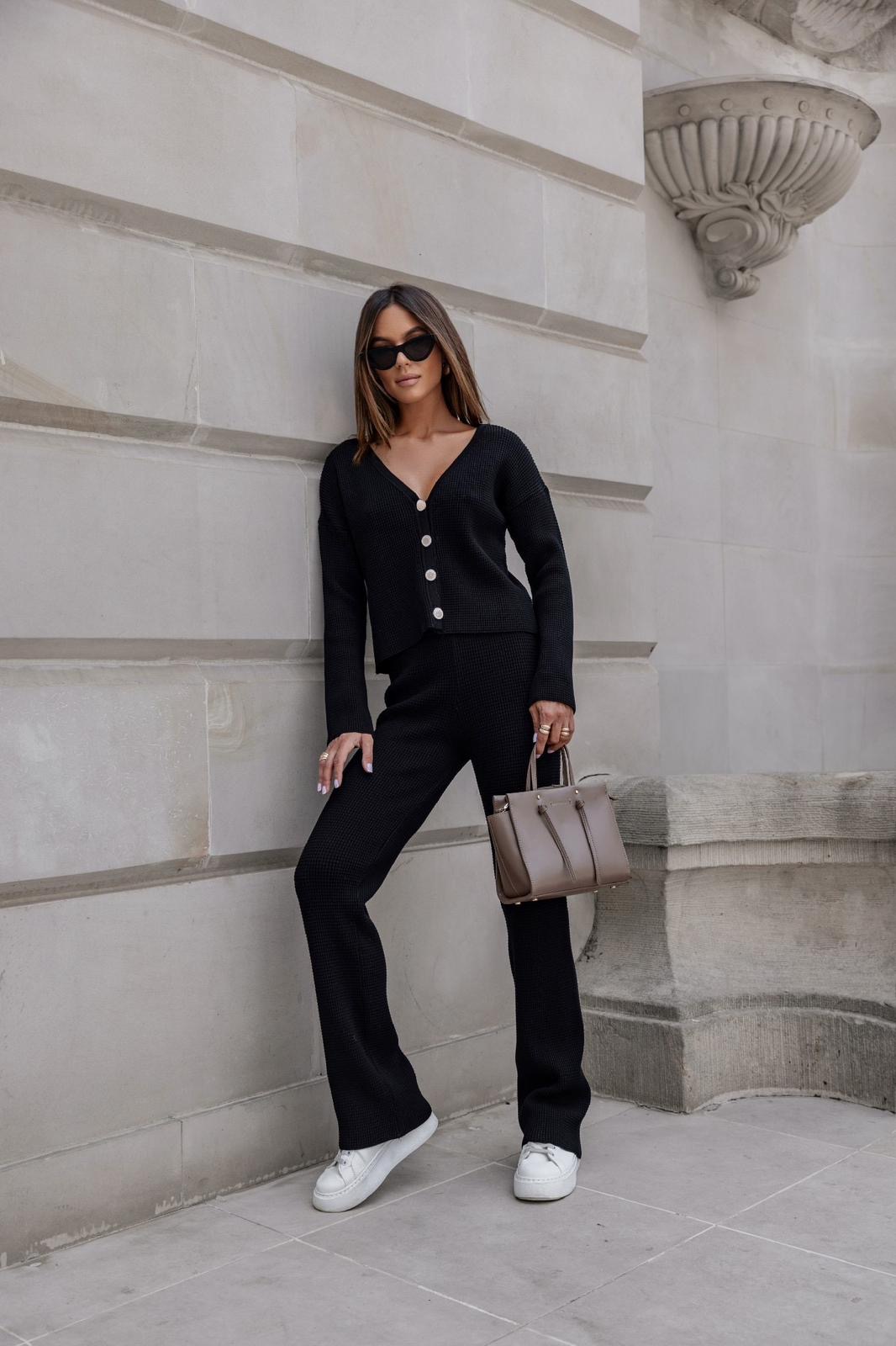Spodnie wykonane z wysokiej jakości przędzy. Posiadają szerokie, luźne nogawki z wysokim stanem oraz ściągaczem w talii.