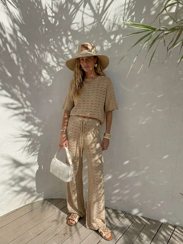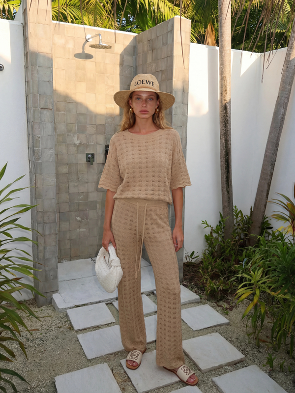 Wygodny, codzienny, ażurowy komplet składający się z luźnego swetra i prostych spodni z elastyczną talią. Idealna propozycja na luźne wyjścia, spacer jak i zakupy.