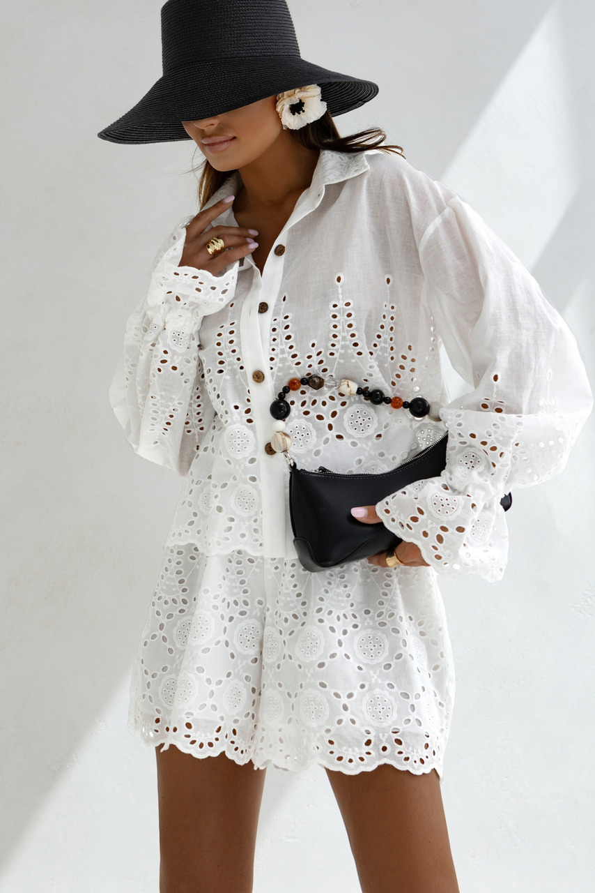 Stylowy i lekki komplet-idealny na lato. Bazuje na białej, ażurowej tkaninie typu angielskie hafty, co nadaje mu romantycznego, wakacyjnego charakteru.