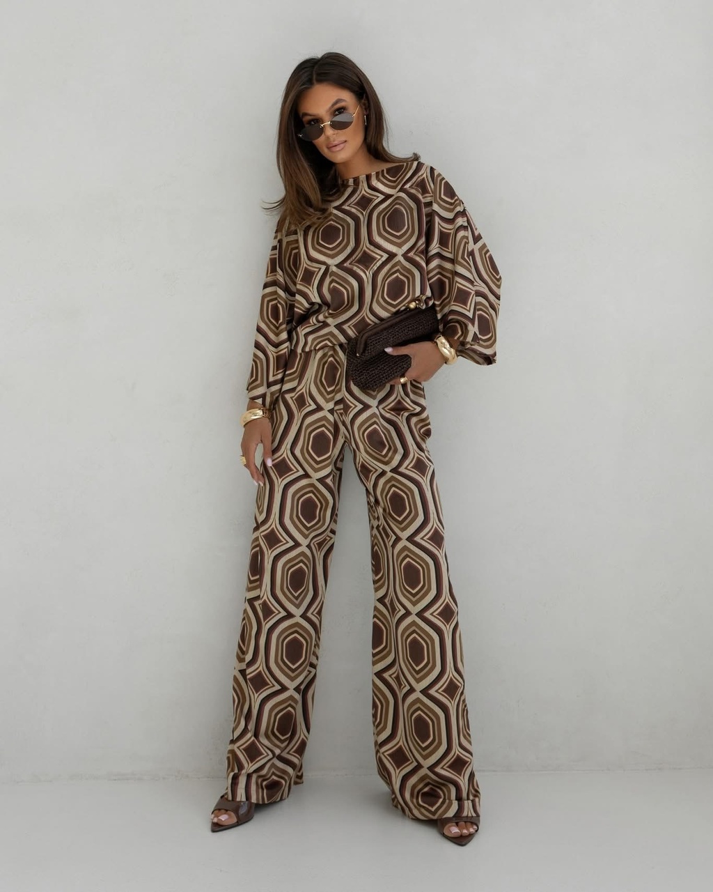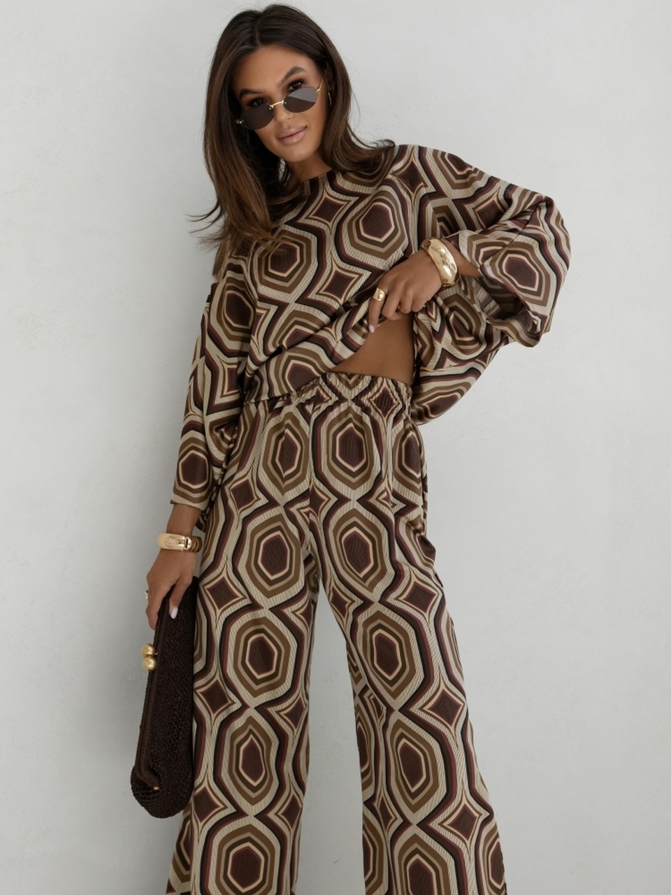 Idealne połączenie klasyki i odważnym geometrycznym wzorem. Dwuczęściowy zestaw składa się luźnej bluzki z długim rękawem i szerokich spodni z wysokim stanem, które optycznie wydłużają nogi dodają elegancji.