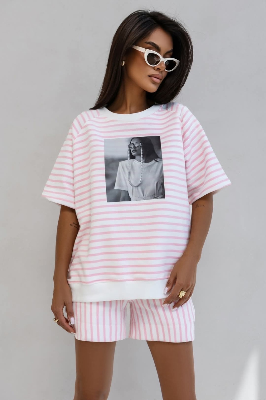 Stylowy, dwuczęściowy komplet składający się z bluzki i krótkich spodenek w biało różowe paski. Bluzka ozdobiona jest nowoczesnym nadrukiem w stylu black & white dodającym charakteru.