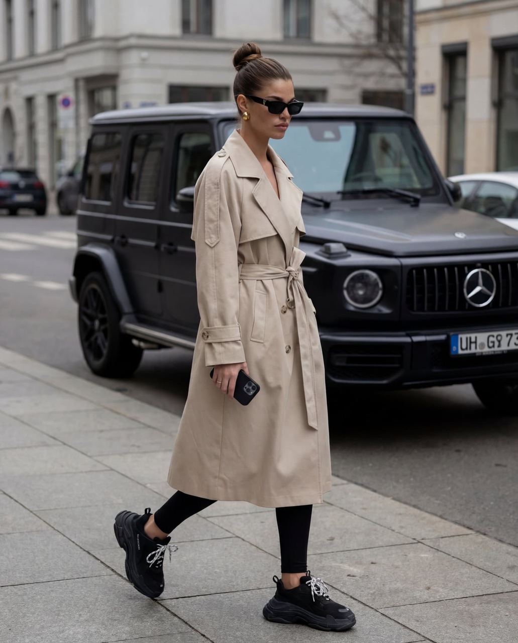 Świetny trencz zapinany na dwurzędowe guziki, posiada poduszki na ramionach oraz pasek z ozdobną klamrą. Dopełnieniem płaszcza są mankiety, oraz kołnierz.