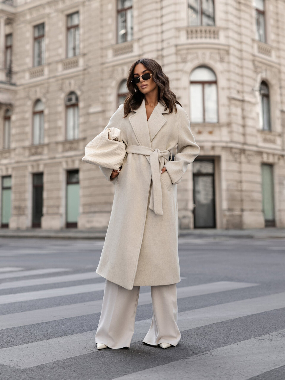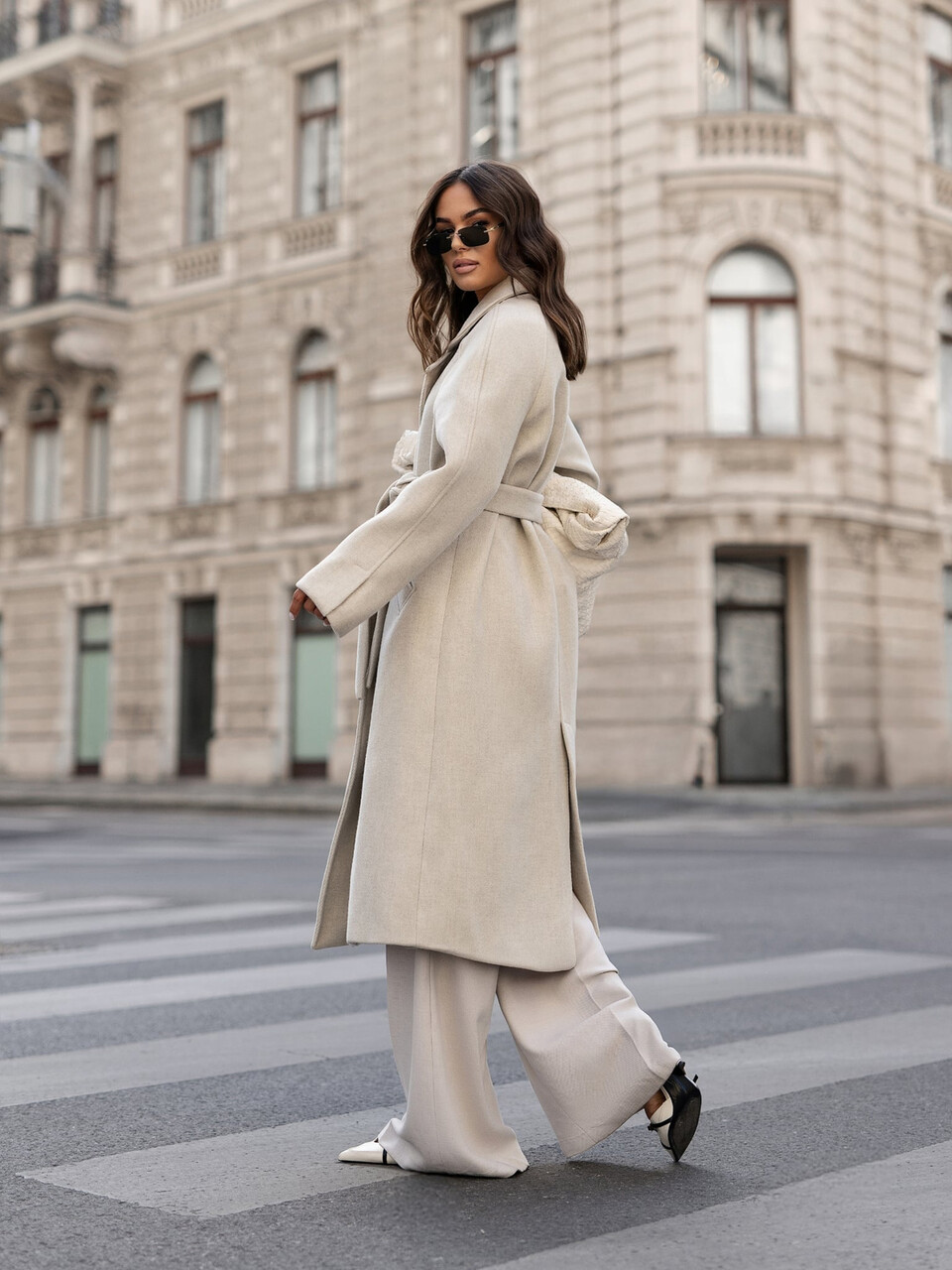 Płaszcz, który definiuje współczesną elegancję w miejskim wydaniu. Ten model to idealne połączenie komfortu i wyrafinowanego stylu. Wykonany z wysokiej jakości materiału, gwarantuje ciepło i trwałość na lata. Swobodny, a jednocześnie wysoce elegancki fason z szerokim kołnierzem i głębokim wycięciem optycznie wydłuża sylwetkę, a szeroki pasek pozwala na idealne dopasowanie w talii.