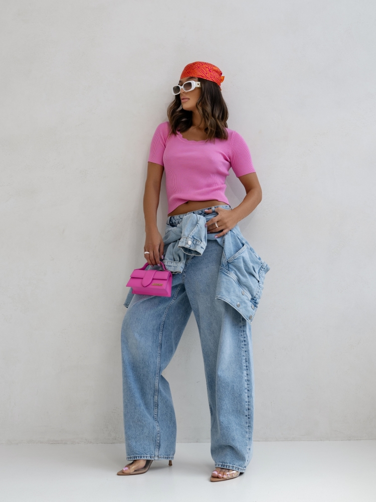 Prążkowana bluzka z krótkim rękawem i ozdobnym, falowanym dekoltem. Dopasowany krój idealnie podkreśla sylwetkę. Świetna baza do codziennych i bardziej stylowych zestawów.
