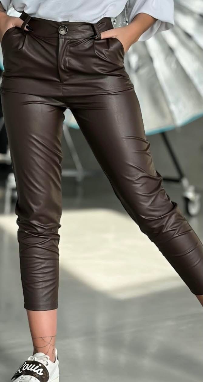 Spodnie z cieniutkiego materiału woskowanego, bardzo przypominającego prawdziwą skórę. Spodnie zapinane są na guzik, oraz zamek błyskawiczny.