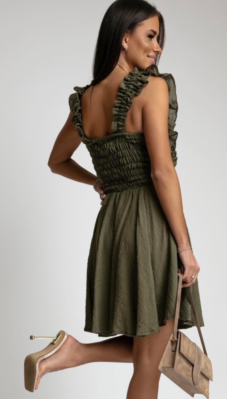 Sukienka rozkloszowana, w talii ściągacz, który optycznie wyszczupla sylwetkę. Liczne subtelne drobne falbanki na ramiączkach dodają subtelności. Posiada kobiecy V-dekolt.