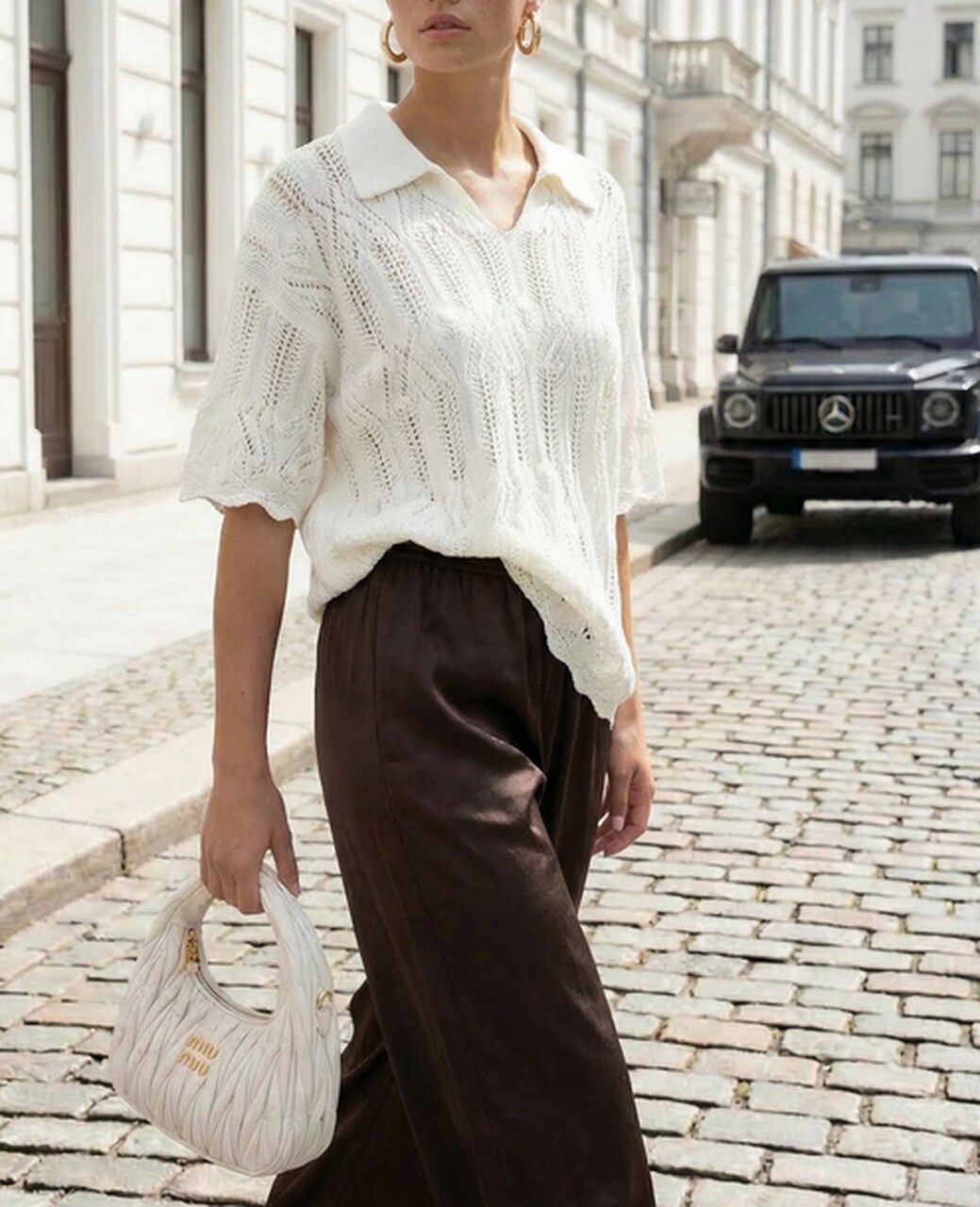 Wyjątkowy ażurowy sweterek z efektownym kołnierzykiem, który dodaje nie codziennej elegancji.