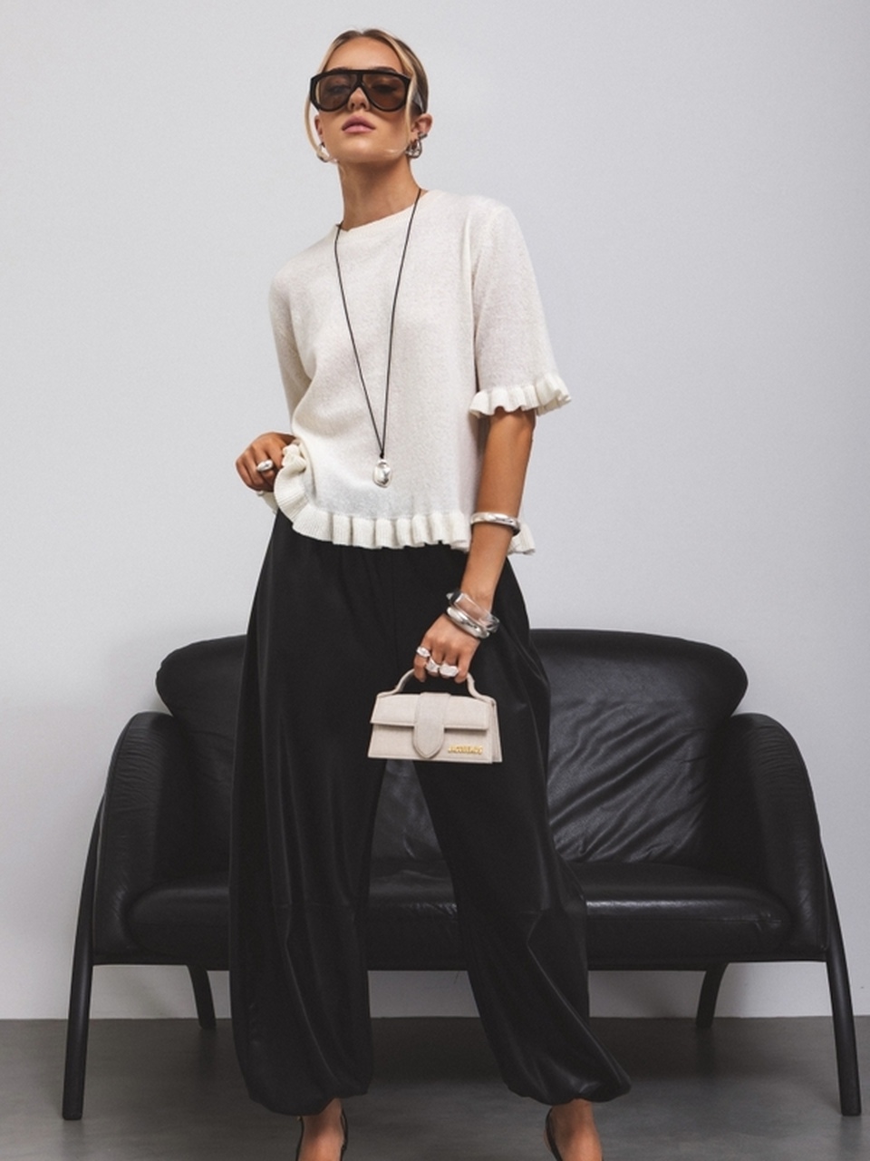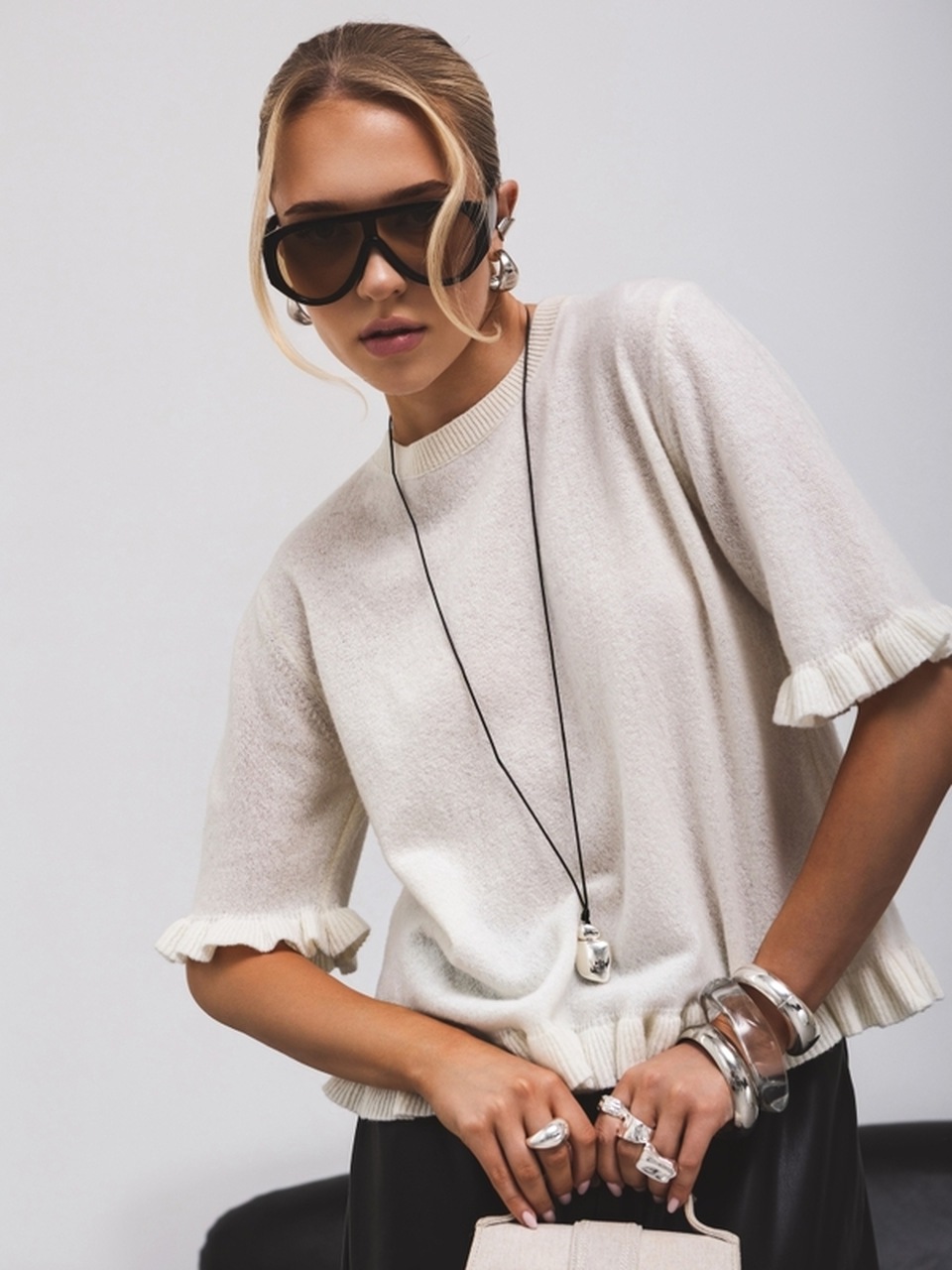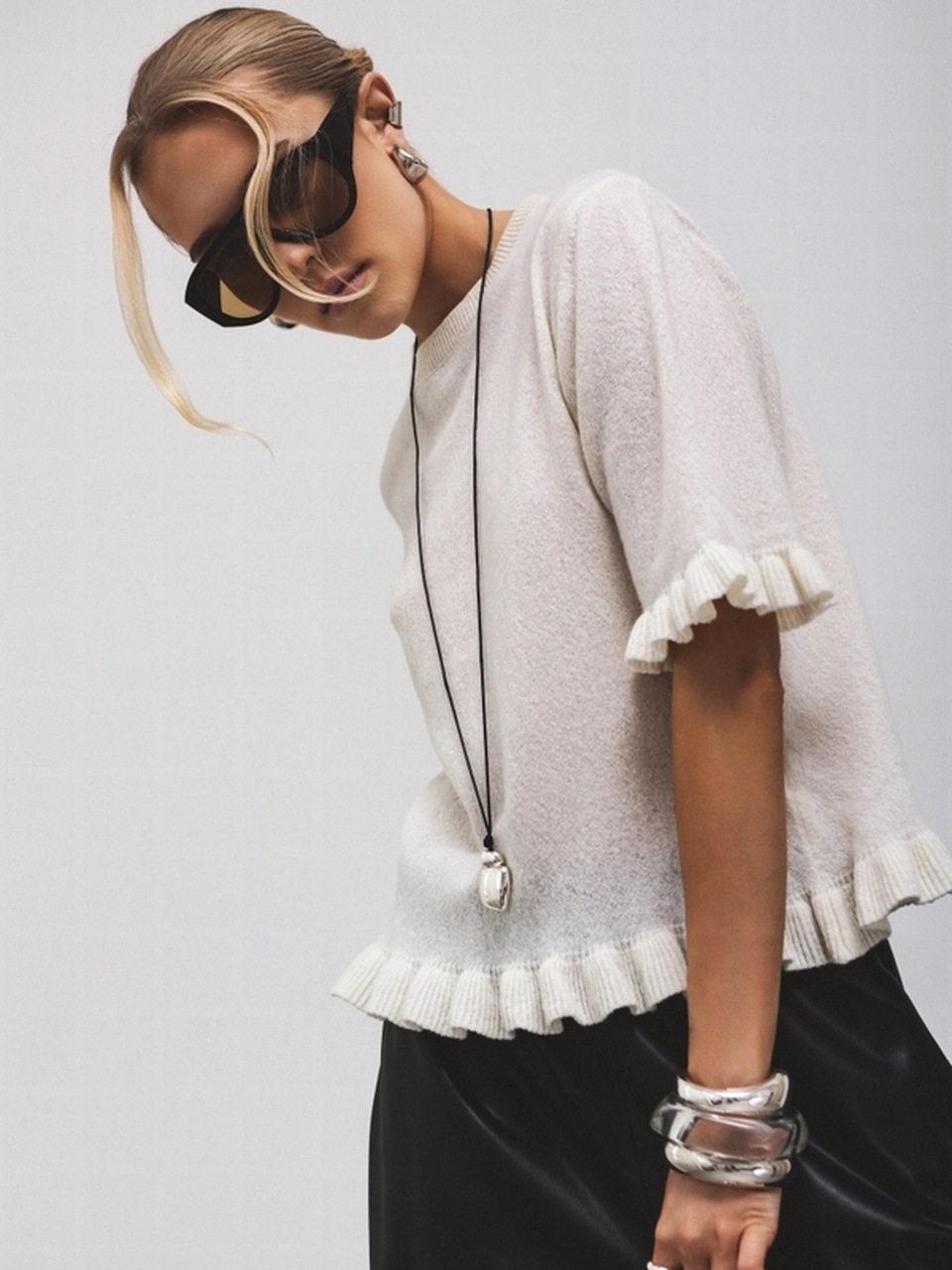 Wełniany sweterek o luźnym króju zapewni komfort noszenia oraz wiele możliwości wystylizowania go. Całość dopełniają urocze falbany na wykończeniach.