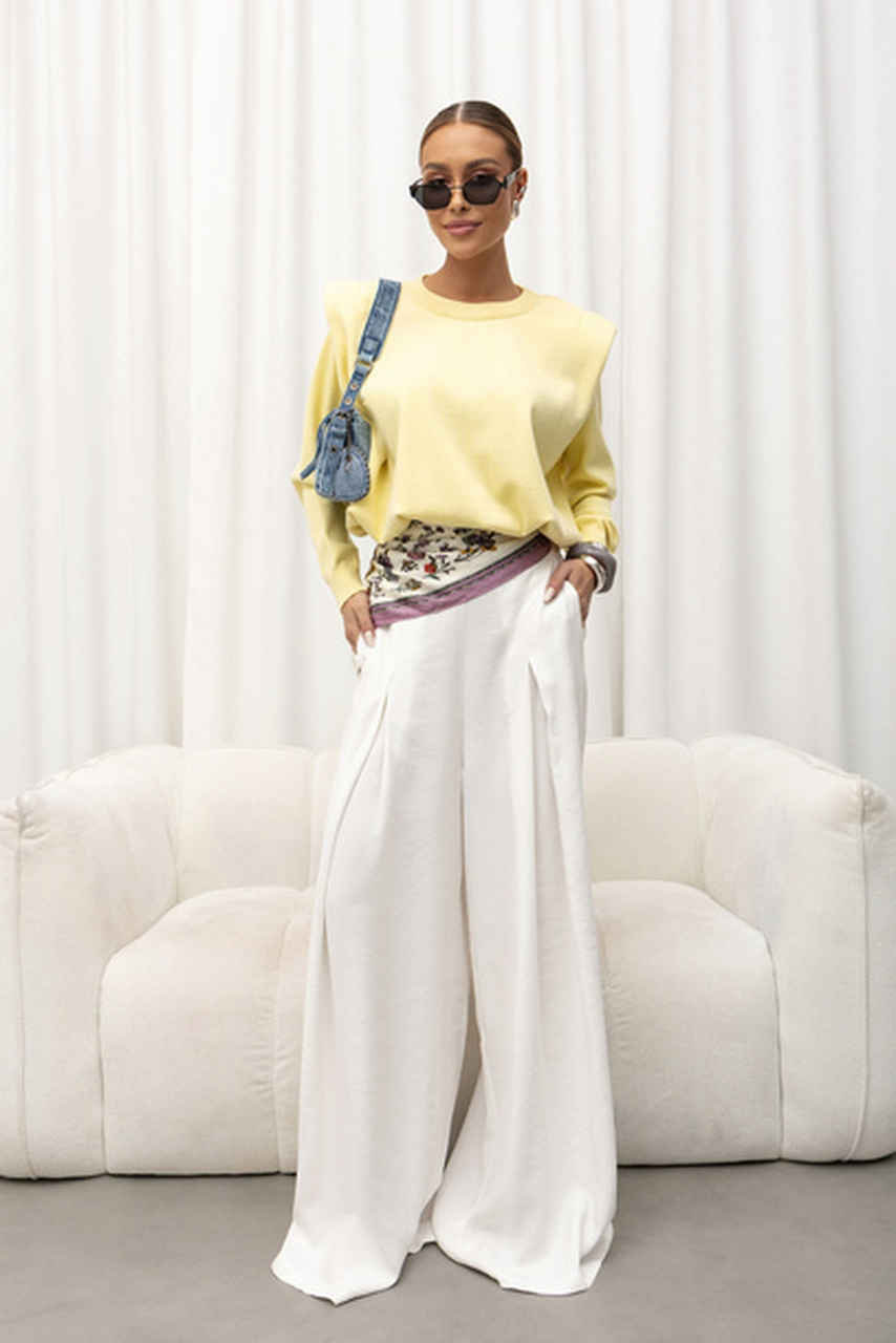Sweter krótki z gumką na dole do regulacji. Ma okrągły dekolt, ściągacze na wykończeniach i poduszki w ramiączkach, co dodaje mu wyjątkowego charakteru. To modny i wygodny wybór na różne okazje, który pozwala wyrazić swoją indywidualność i czuć się stylowo.