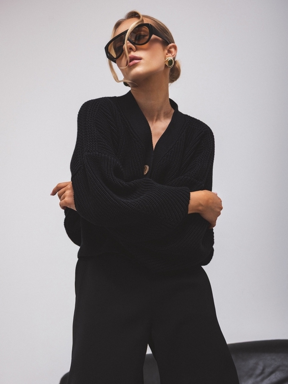 Stylowy kardigan o oversize’owym kroju zapinany na guziki. Wykonany z miękkiej dzianiny, z szerokimi rękawami i głębokim dekoltem w serek. Idealny do codziennych i wygodnych stylizacji.