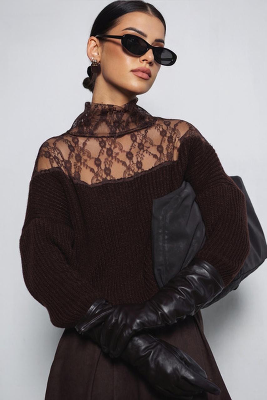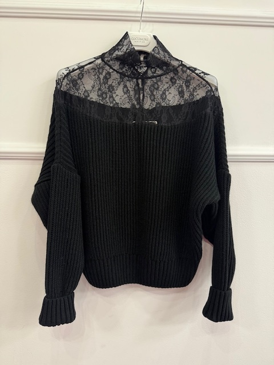 Elegancki sweterek, którego charakterystycznym elementem jest koronkowa wstawka na ramionach. Koronka jest półprzezroczysta w kwiatowy wzór co czyni ten model bardzo kobiecym.